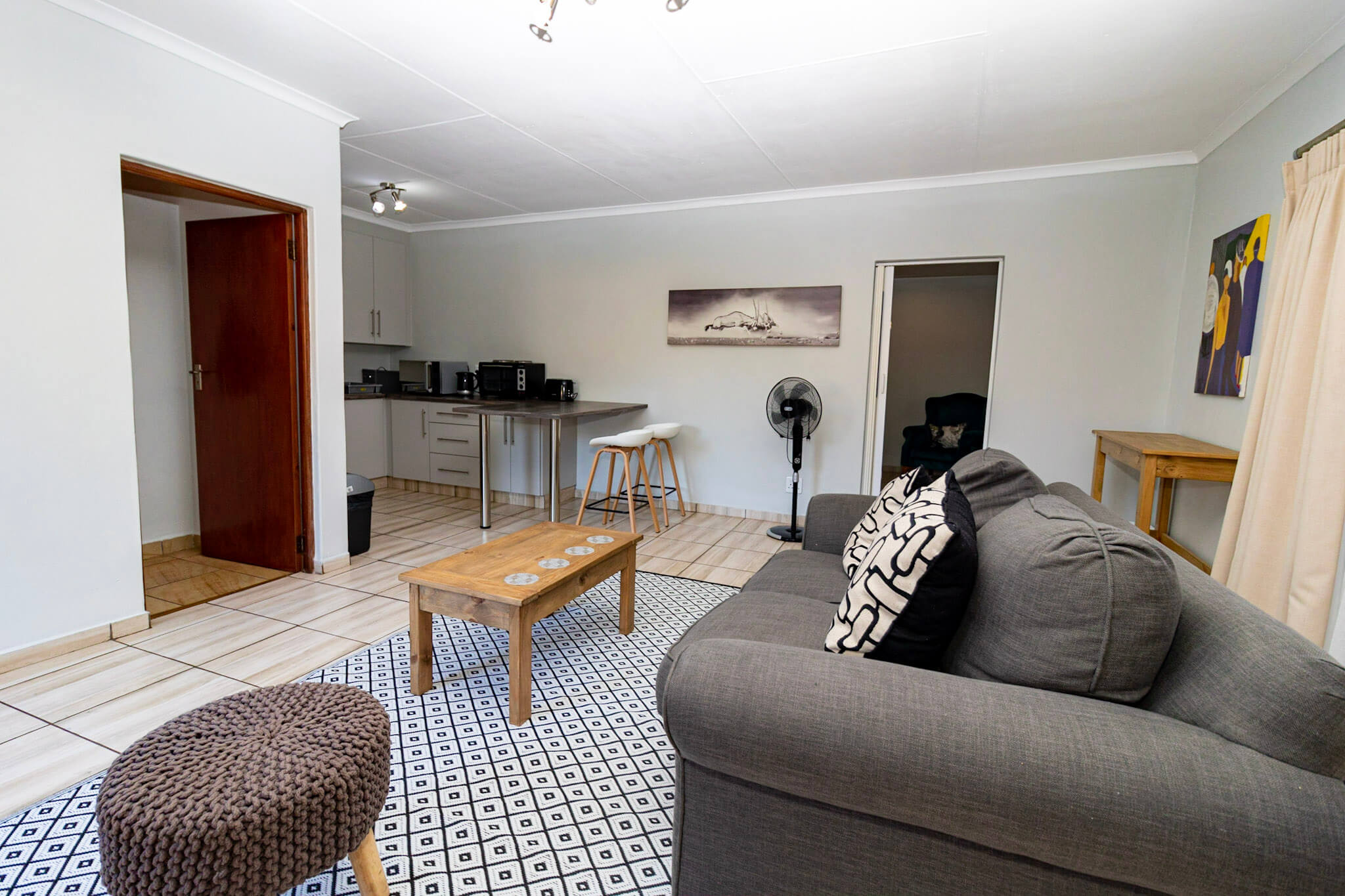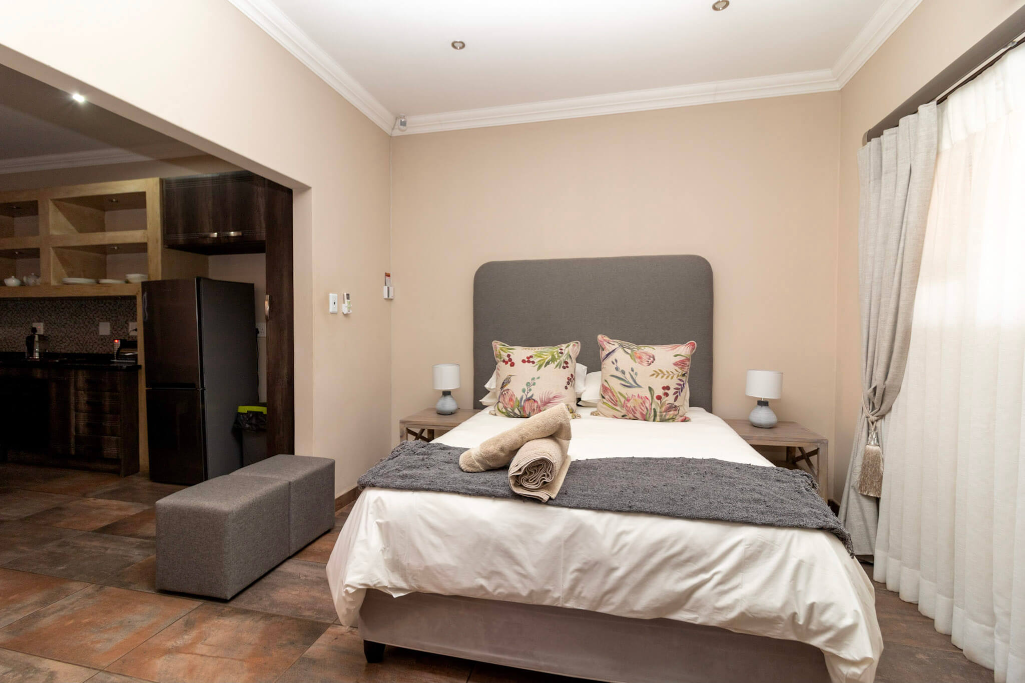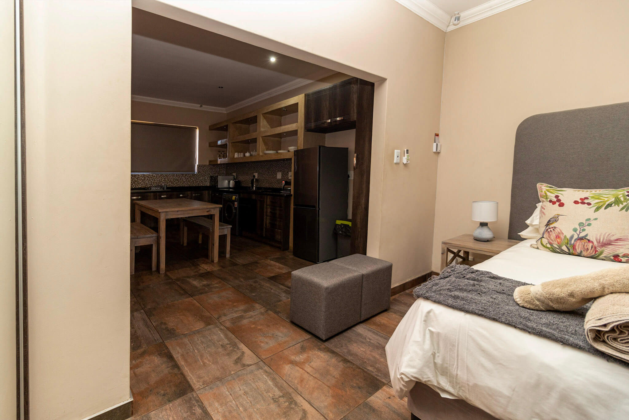 Luxurious air-conditioned, one bedroom separate from main house. This unit features a queen size bed and an en-suite bathroom fitted with a shower, toilet and baisin. For convenience, cotton sheets and towels are provided. The unit has a fully equipped kitchen for self-catering and features a mini oven stofe, fridge, toaster, kettle and microwave. In-room facilities include a lounge with a sofa, Smart TV, selected DSTV channels and unlimited Wi-Fi access.