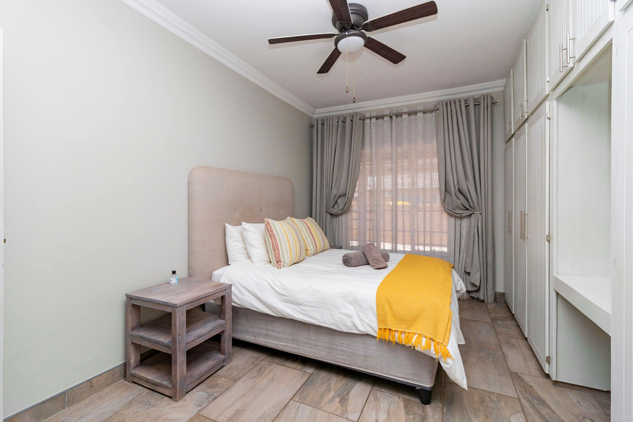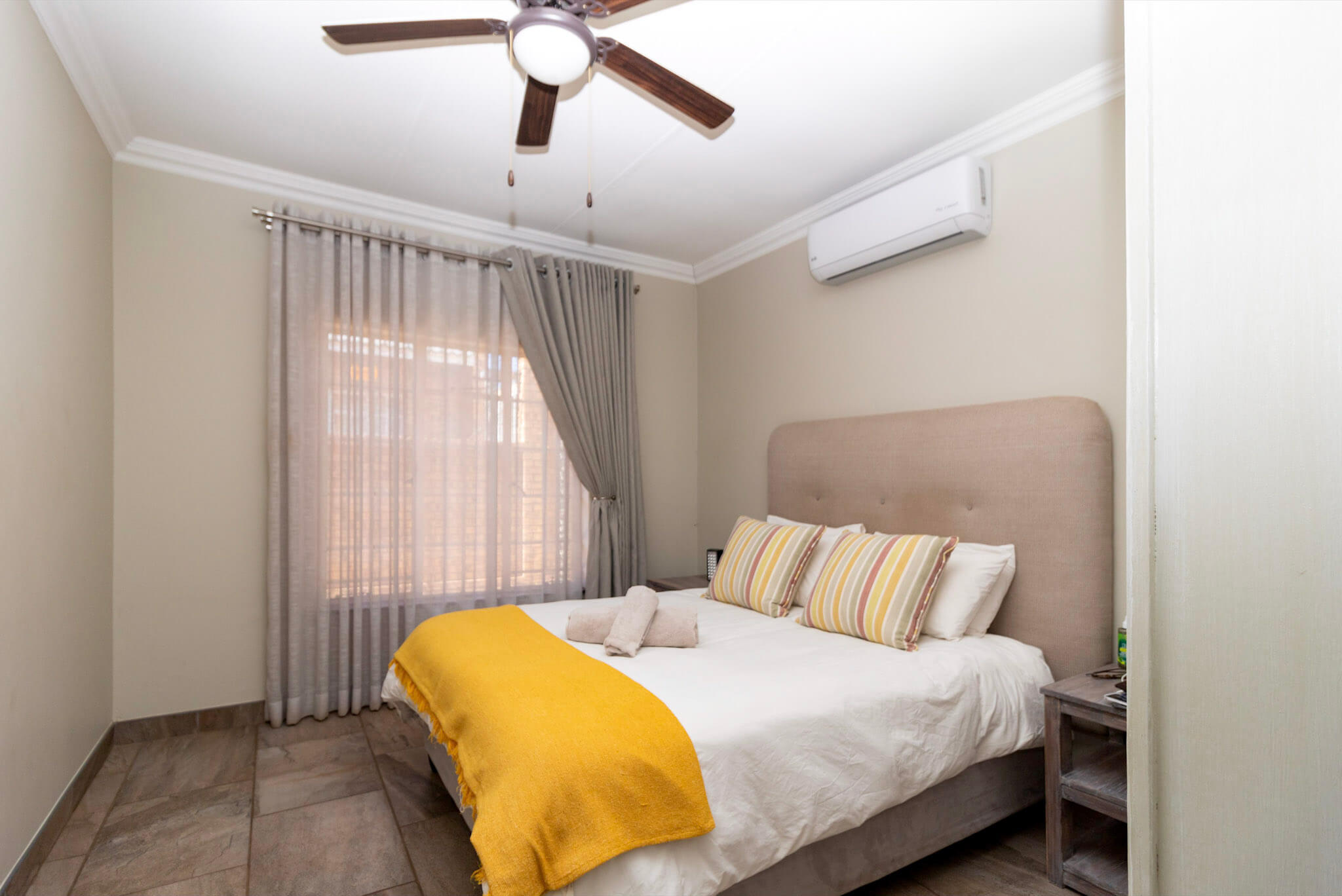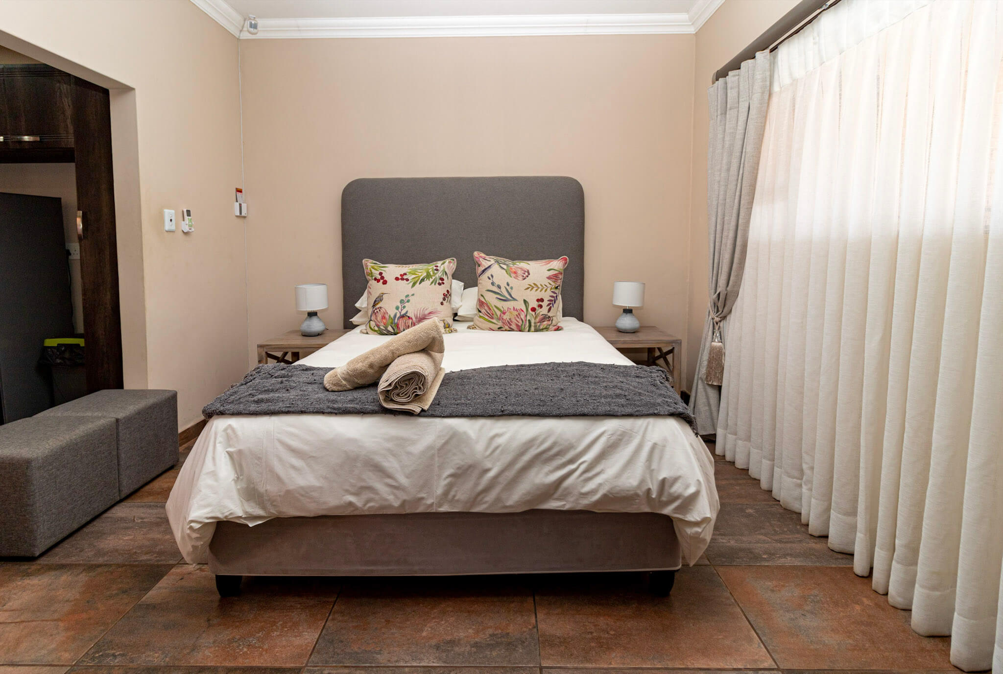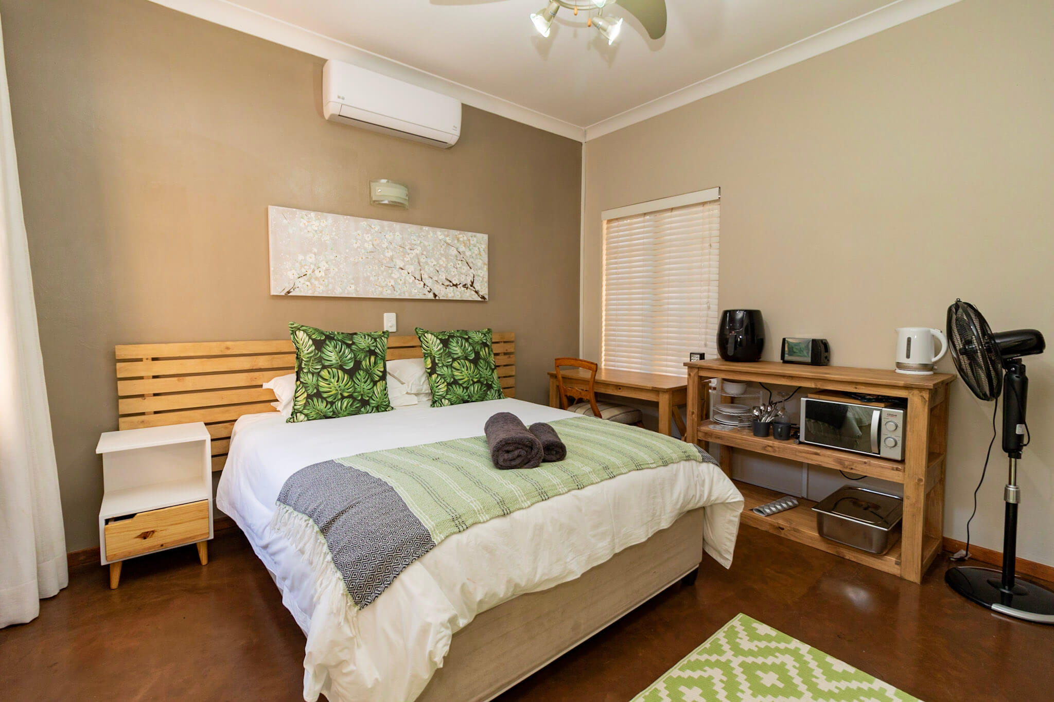 Luxurious airconditioned suite with its own unique ambience, is furnished with a queen size bed, en-suite bathroom with shower and toilet. For convenience, cotton sheets and towels are provided. The room is equipped with a mini kitchenette with a Microwave, Air Fryer, Toaster, as well as tea-and-coffee-making facilities. A desk, Unlimited WiFi access, as well as a Smart TV with selected DSTV channels. Please note, smoking is not allowed in the room, but guests may smoke in the garden.