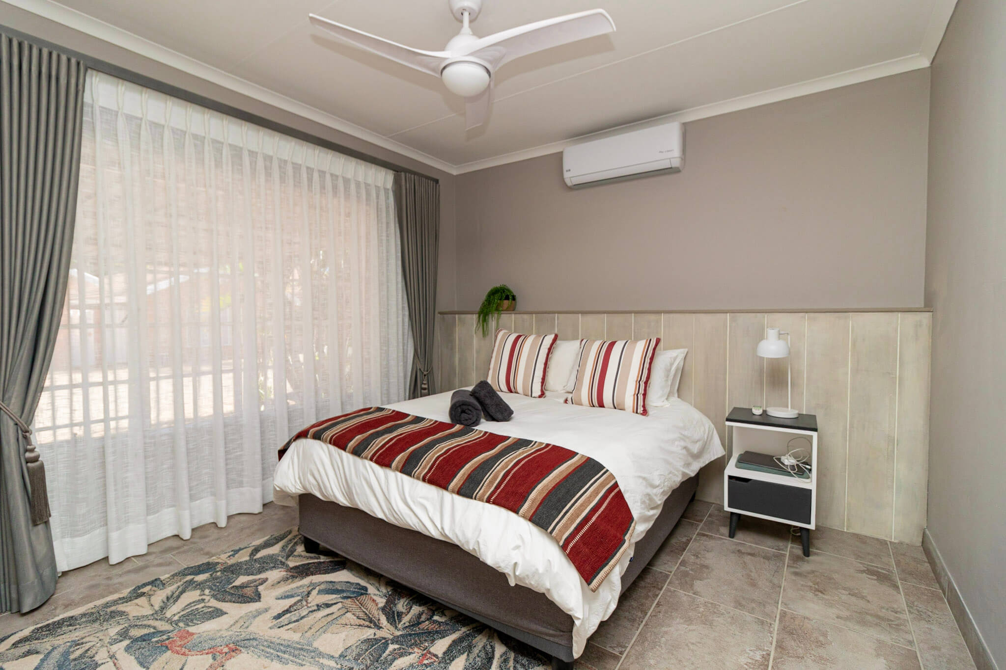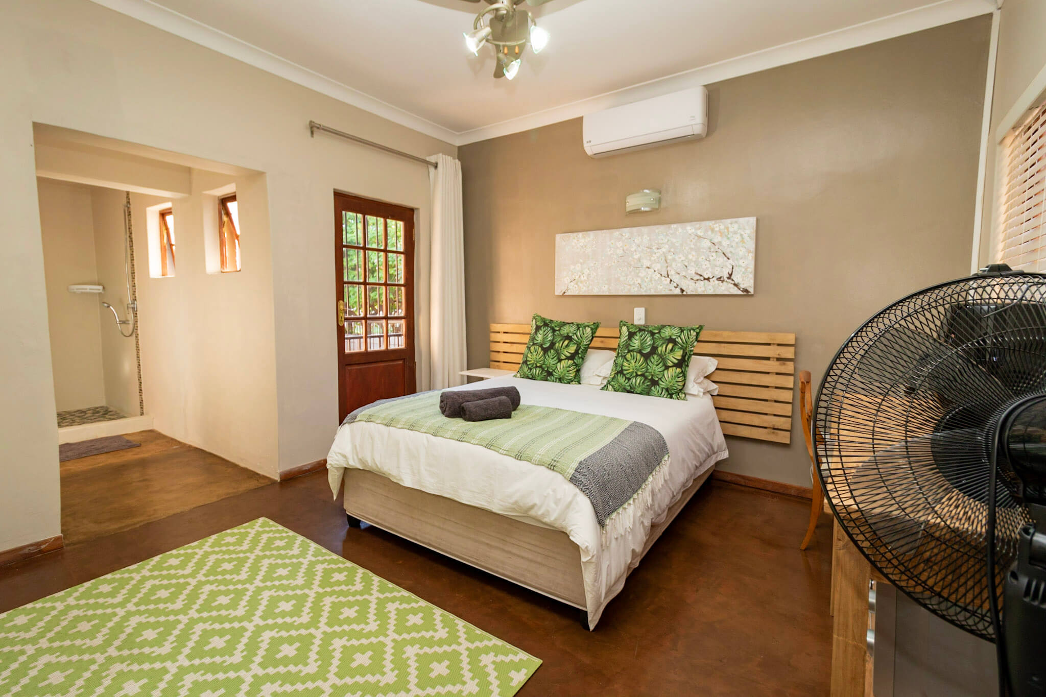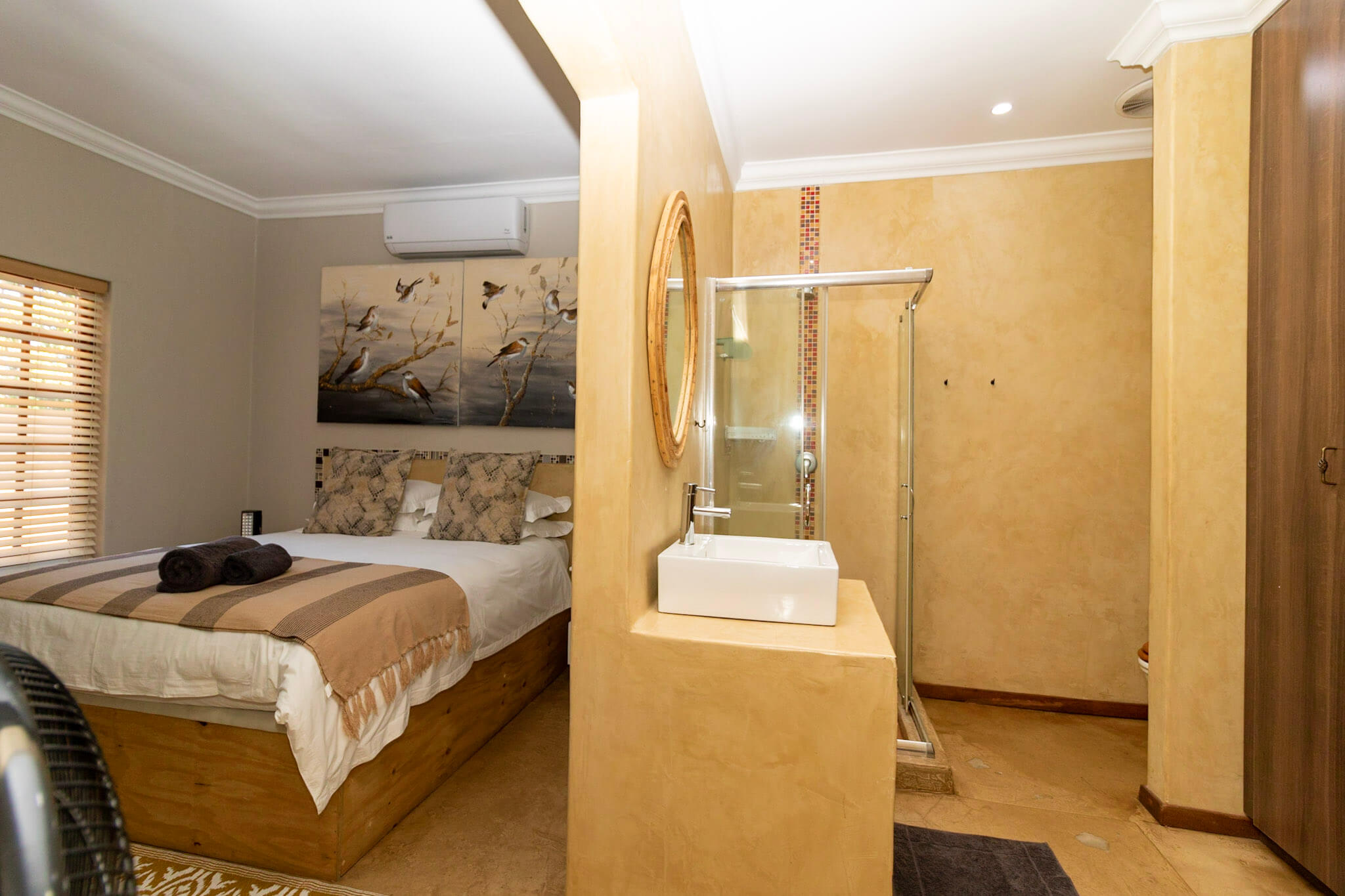 Luxurious airconditioned suite with its own unique ambience, is furnished for two with a queen size bed, en-suite bathroom with shower and toilet. For convenience, cotton sheets and towels are provided. The room is equipped with a mini kitchenette with a Microwave, Air Fryer, Toaster, as well as tea-and-coffee-making facilities. A desk, Unlimited WiFi access, as well as a Smart TV with selected DSTV channels. Please note, smoking is not allowed in the room, but guests may smoke in the garden.