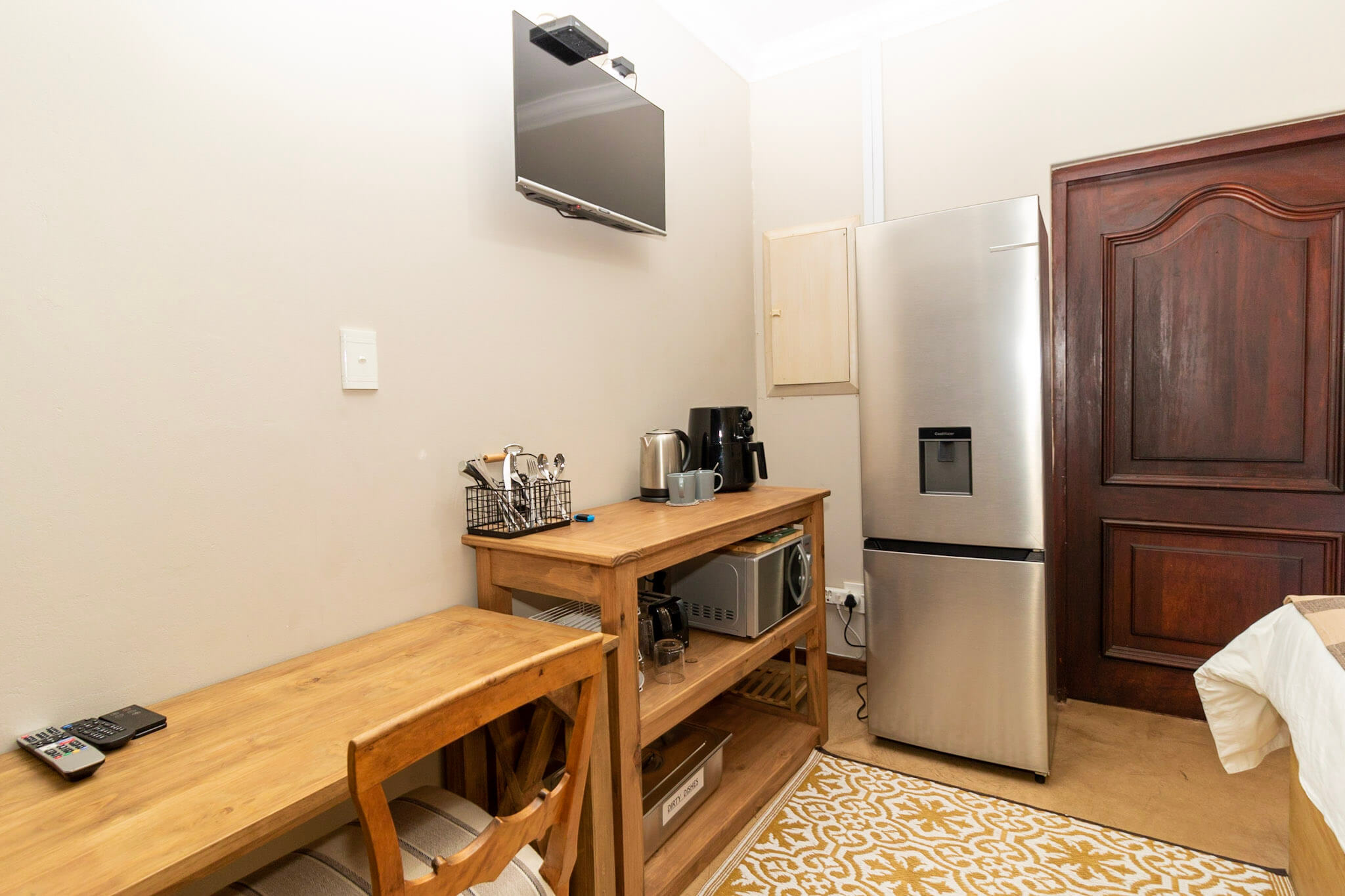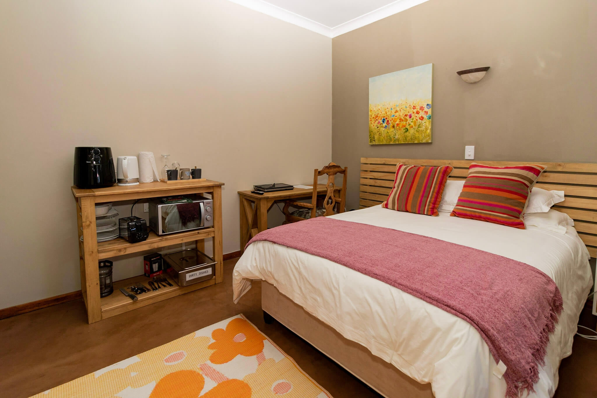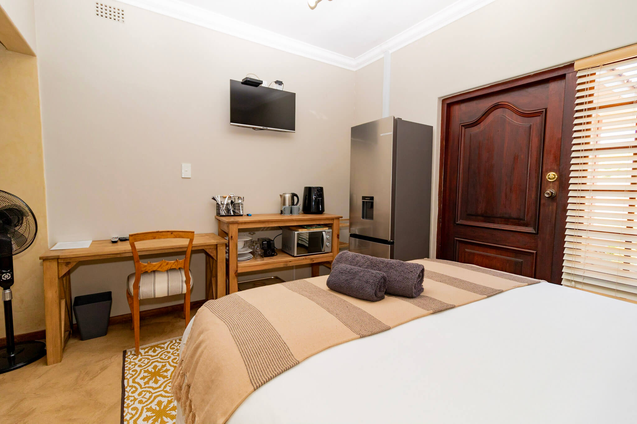 Comfortably furnished for two, the airconditioned open-plan room is furnished with a queen size bed, lounge sofa and has an en-suite bathroom with a shower, bath and separate toilet, and walk-in closet. For convenience, cotton sheets and towels are provided. The room is equipped with a mini kitchenette with a Microwave, a Air Fryer, a Toaster, a Fridge, as well as tea-and-coffee-making facilities. A desk, Unlimited WiFi access, as well as a Smart TV with selected DSTV channels. Please note, smoking is not allowed in the rooms, but guests may smoke in the garden.