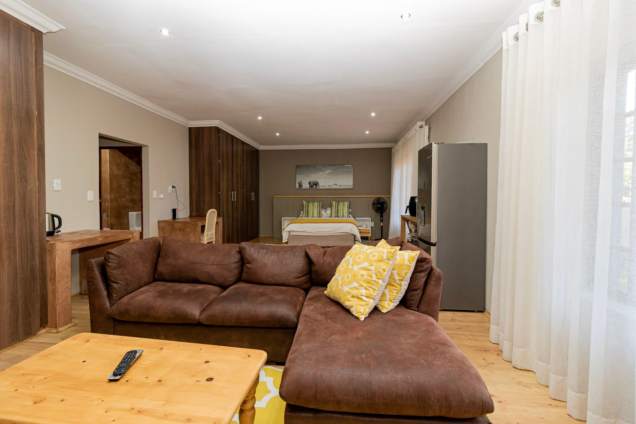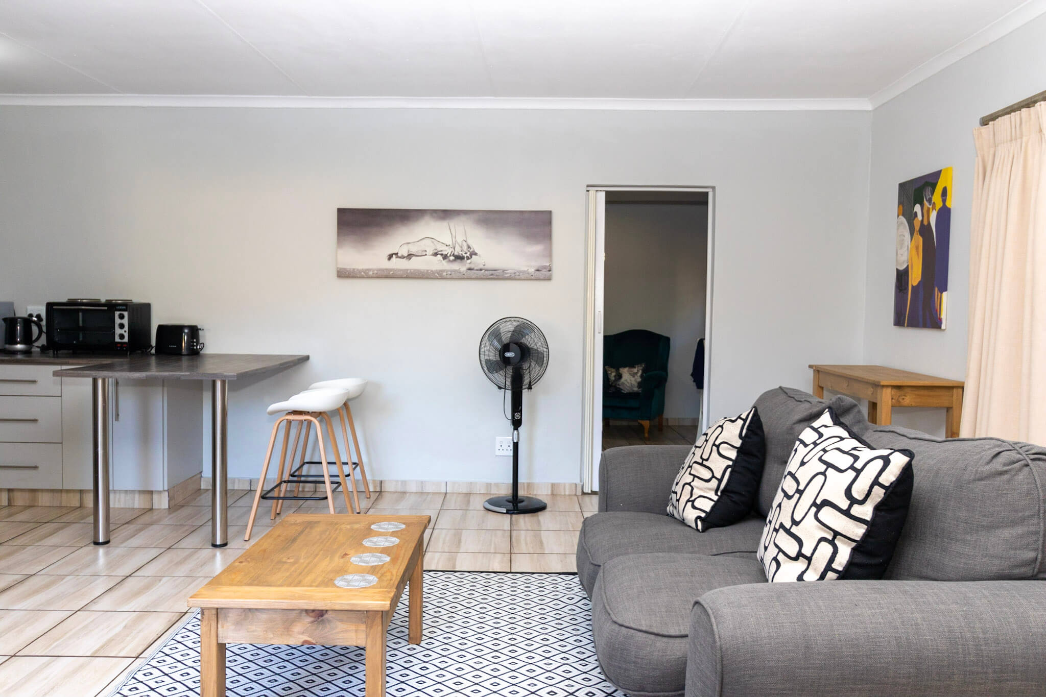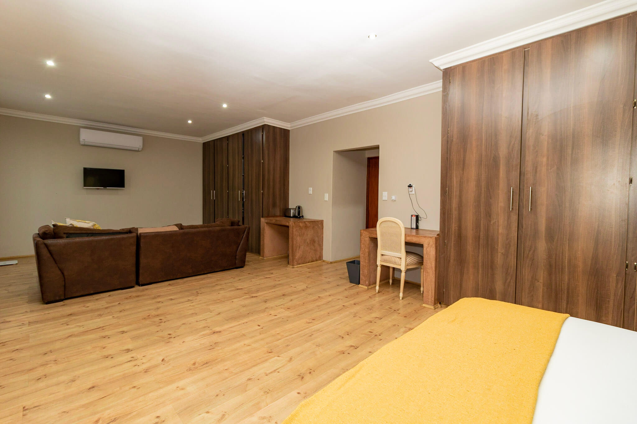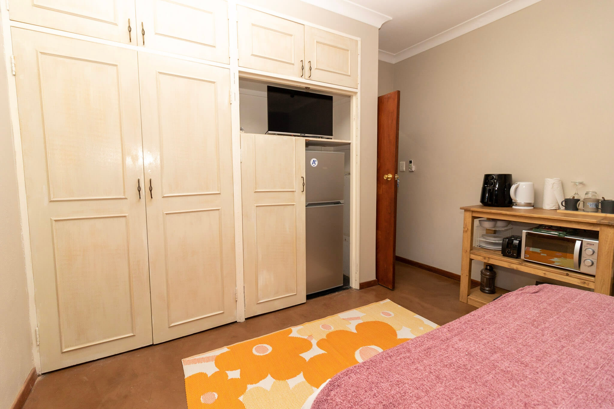 Comfortably furnished for two, the airconditioned open-plan room is furnished with a queen size bed, lounge sofa and has an en-suite bathroom with a shower, bath and separate toilet, and walk-in closet. For convenience, cotton sheets and towels are provided. The room is equipped with a mini kitchenette with a Microwave, a Air Fryer, a Toaster, a Fridge, as well as tea-and-coffee-making facilities. A desk, Unlimited WiFi access, as well as a Smart TV with selected DSTV channels. Please note, smoking is not allowed in the rooms, but guests may smoke in the garden.