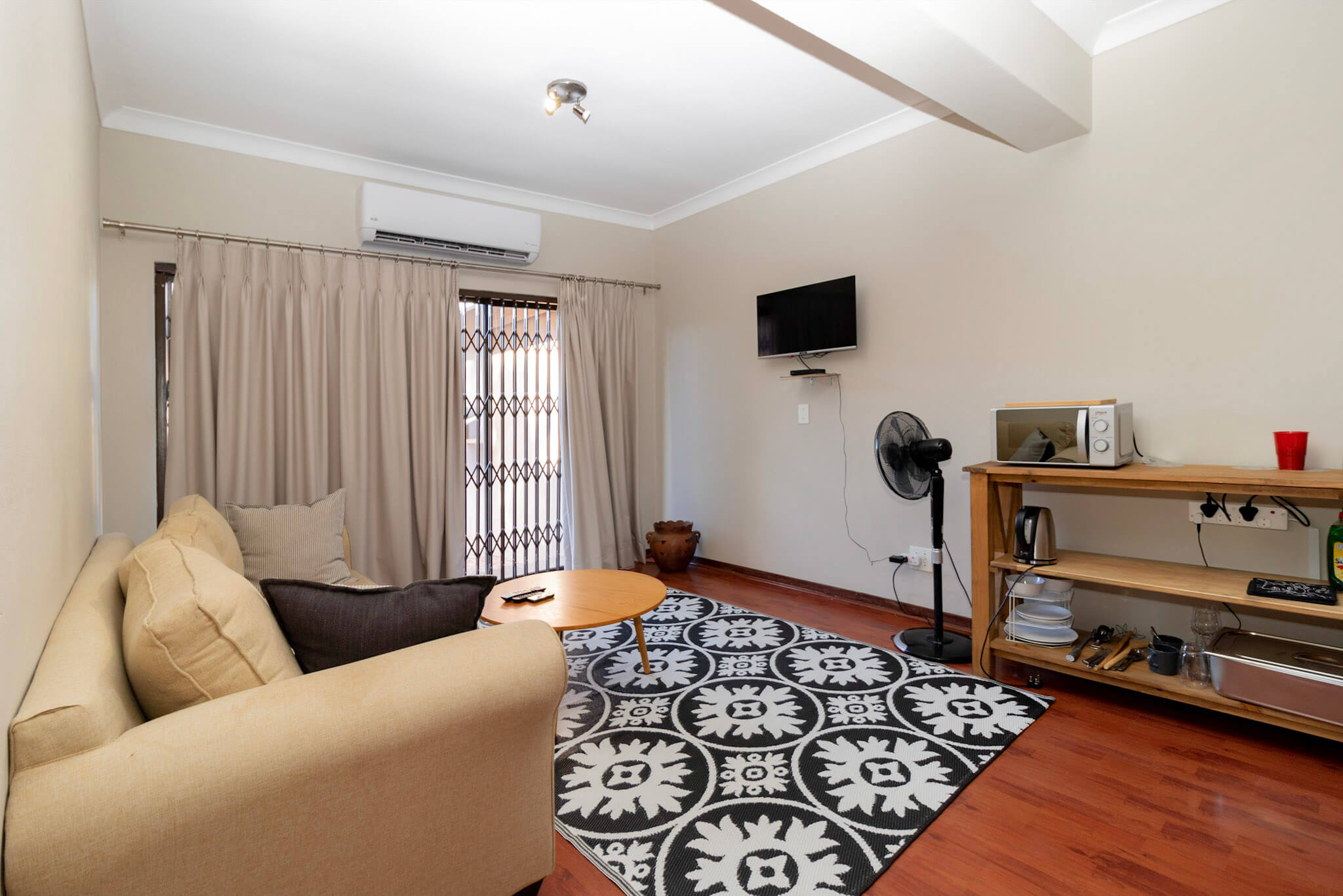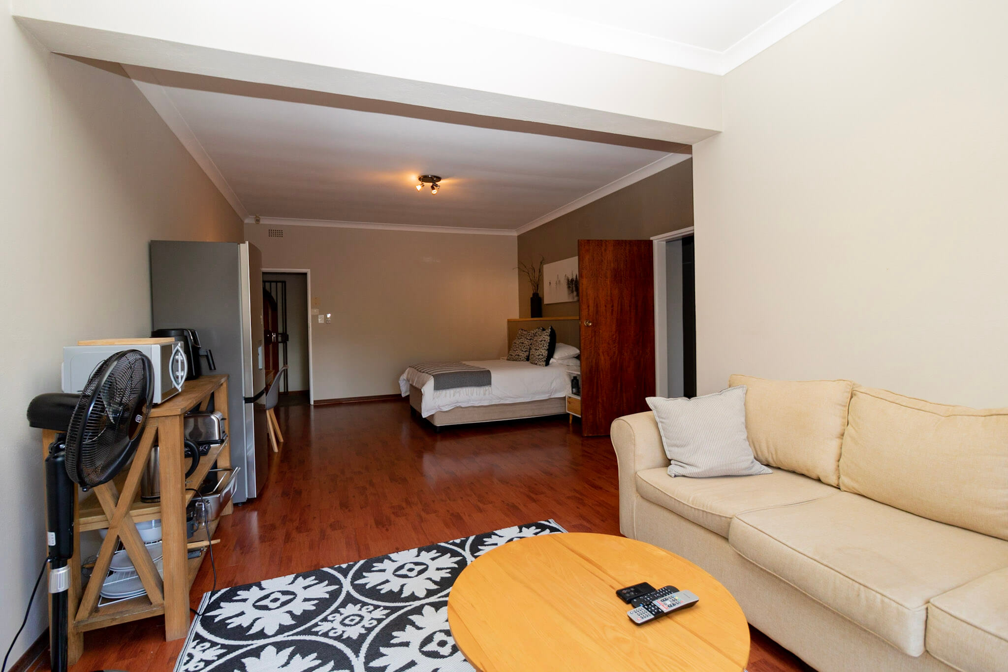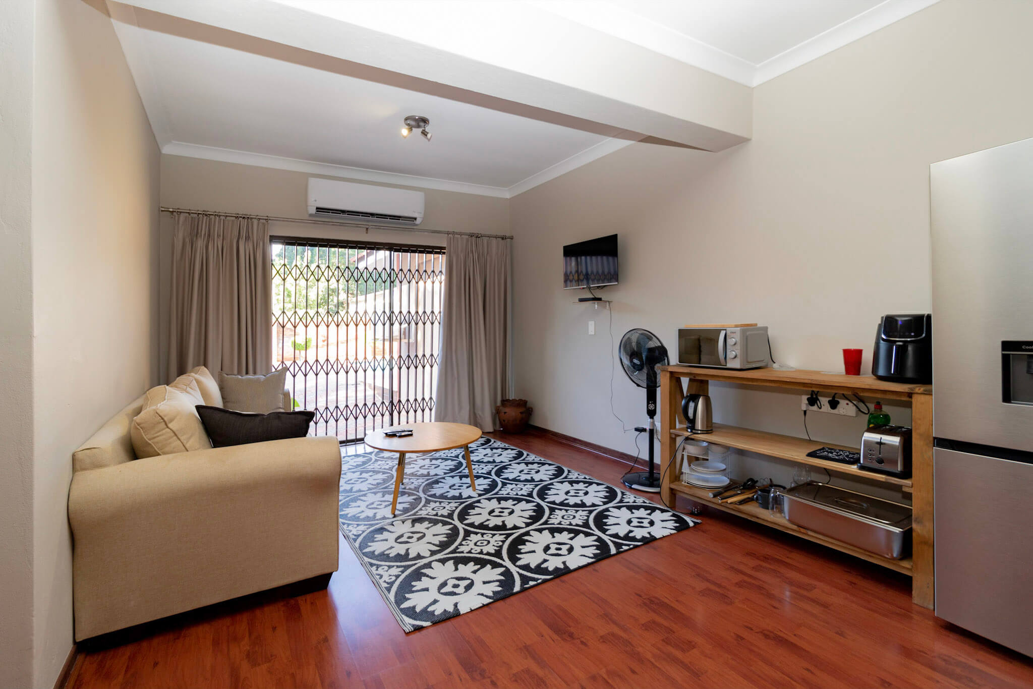 This airconditioning, open-plan room comprises a sleeping area, lounge sofa, a mini kitchenette, and an en-suite bathroom. The sleeping area comprises an queen size bed. The en-suite bathroom is fitted with a bath, shower and toilet. Cotton linen and towels are provided. The mini kitchenette is equipped with a Microwave, Air Fryer, Toaster, Cutlery and Tea-and-Coffee making facilities. The unit also features a desk, unlimited Wi-Fi and a Smart TV with selected DSTV Channels. Please note this is a non-smoking unit, but guests may smoke in the garden.